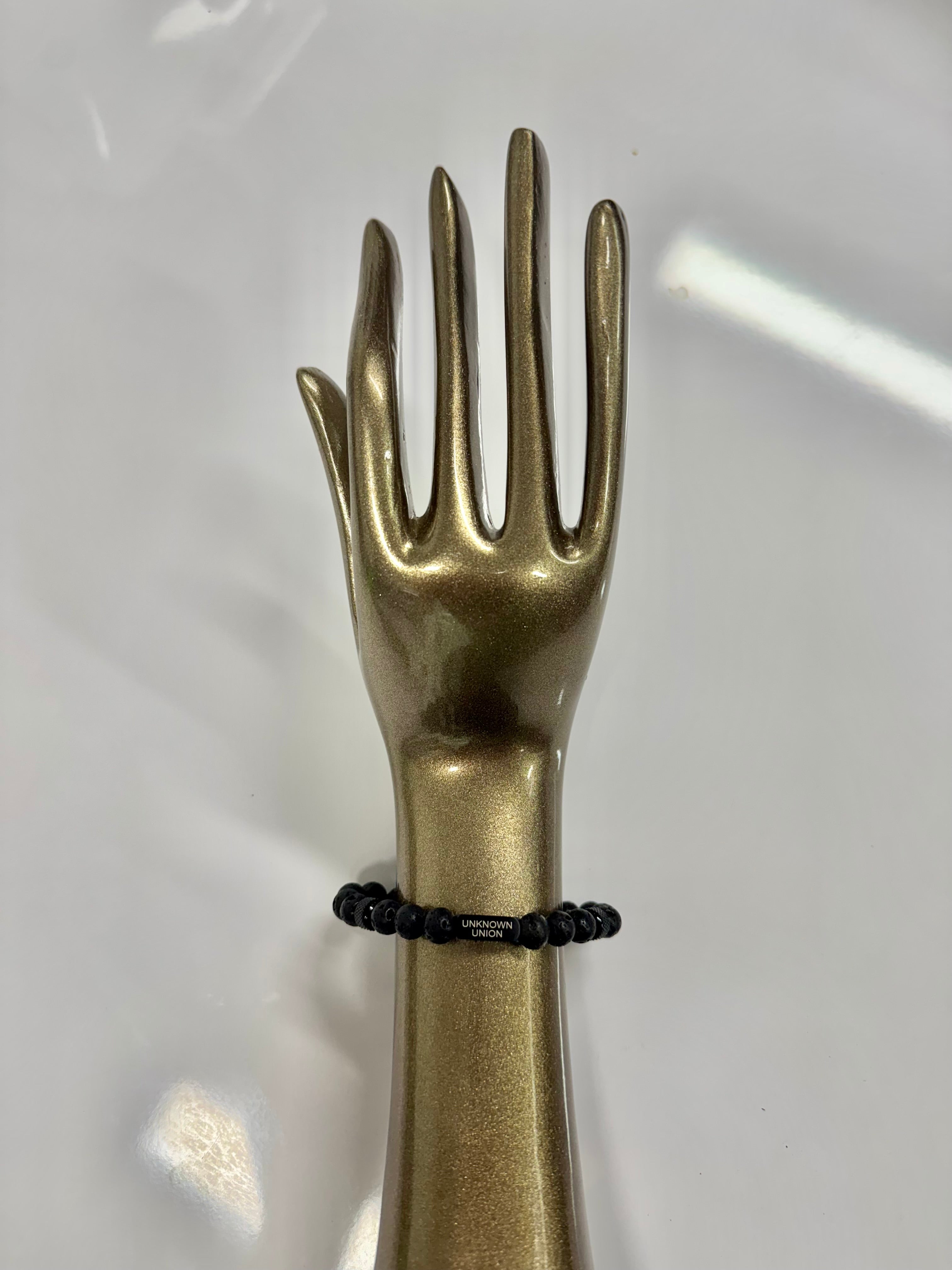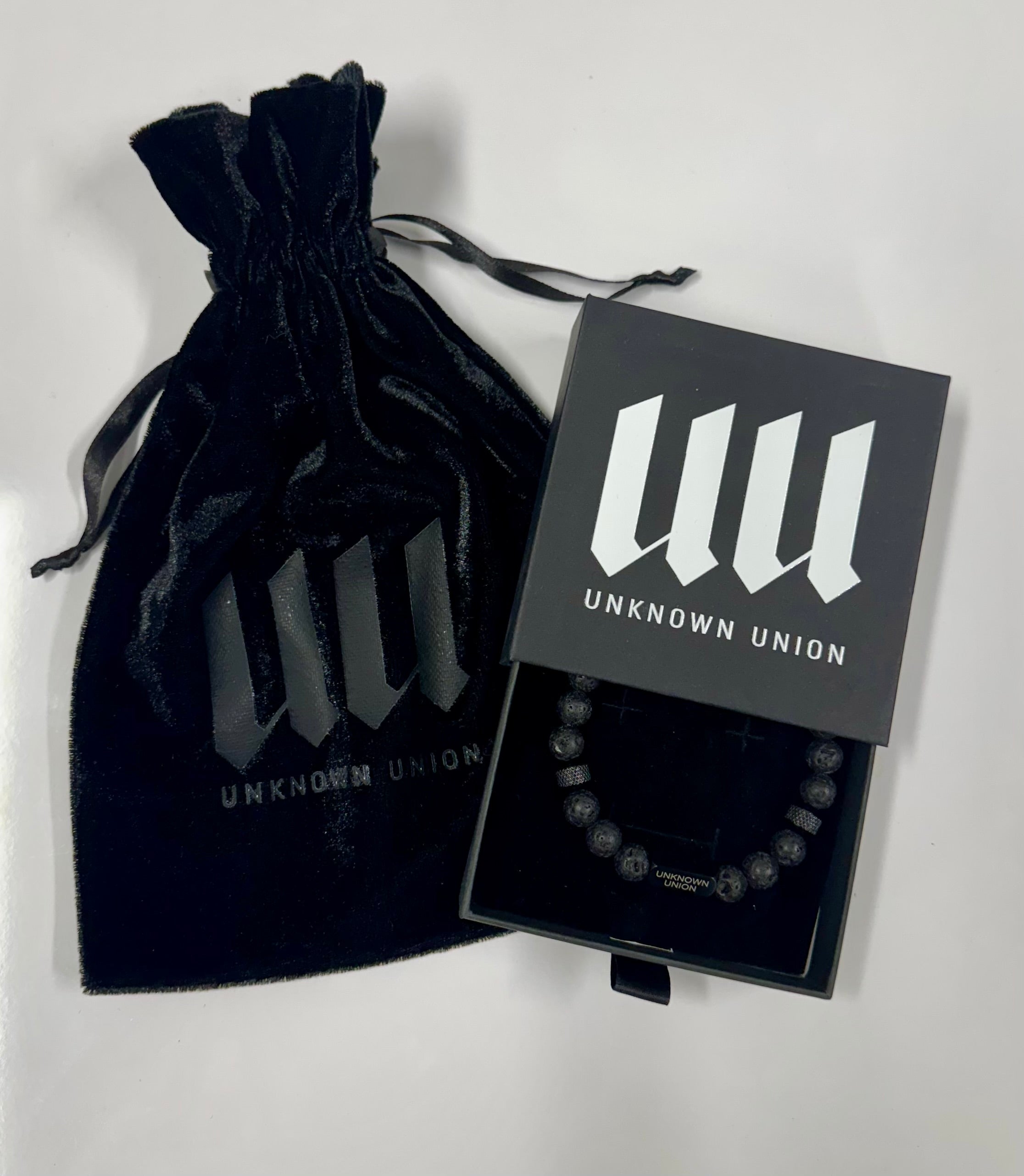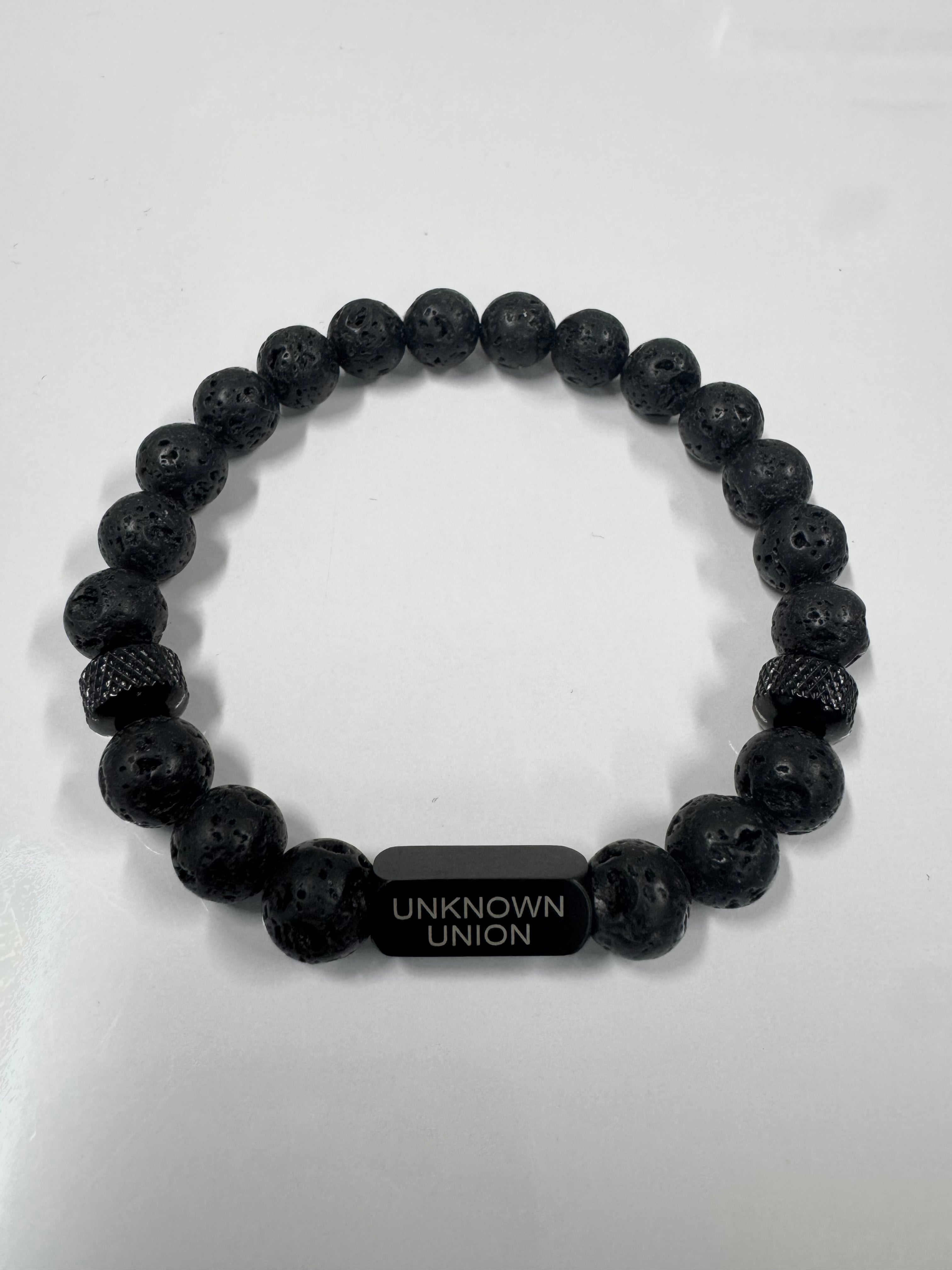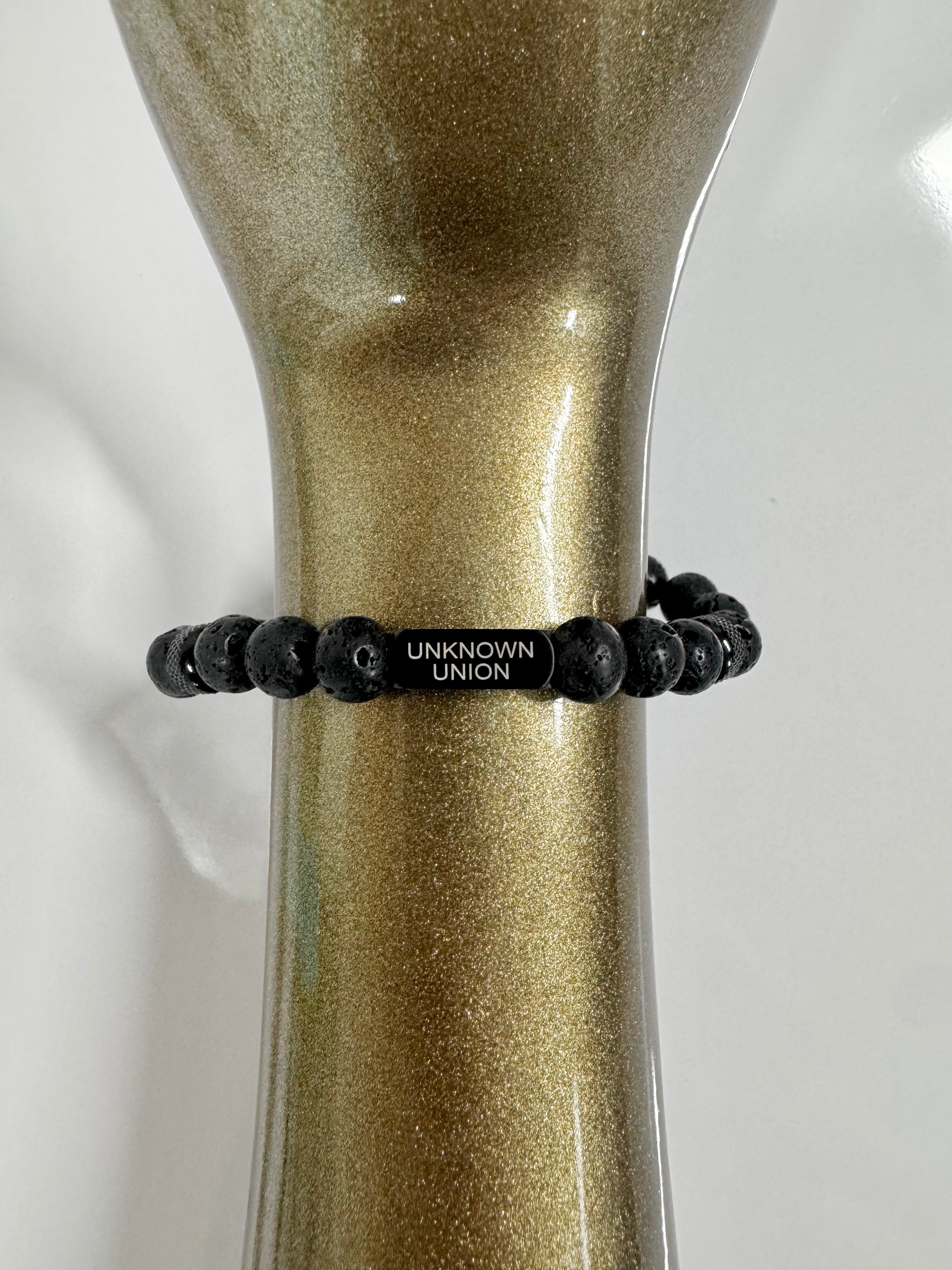 Rooted in the spirit of our Elementals, this bracelet is strung with natural lava beads — stones formed from earth’s most powerful element. Lava beads are believed to carry grounding energy, strength, and renewal, making them a timeless symbol of resilience. At the center, an engraved steel bar reads UNKNOWN UNION, grounding the piece in our shared story