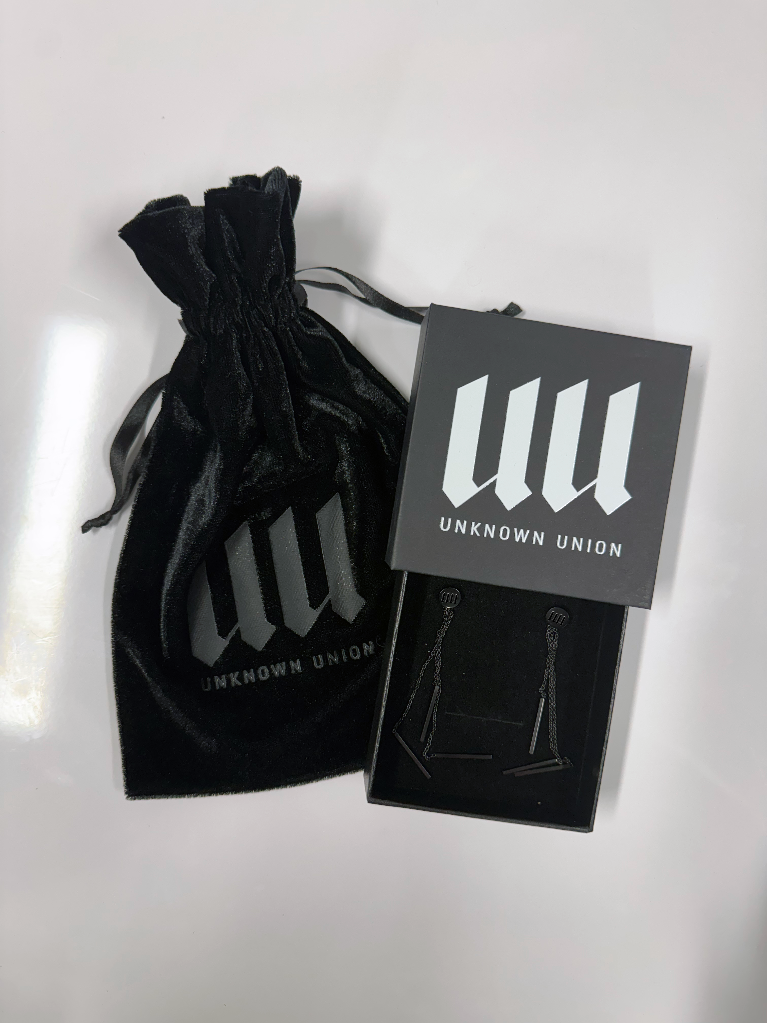 Echoing the steady rhythm of time, these earrings feature the UU emblem embossed on a circular post, with three delicate chains that fall into sleek metal bars. Like pendulums in motion, they serve as a reminder that every moment — like every story — swings into the next, shaping the rhythm of our shared journey.