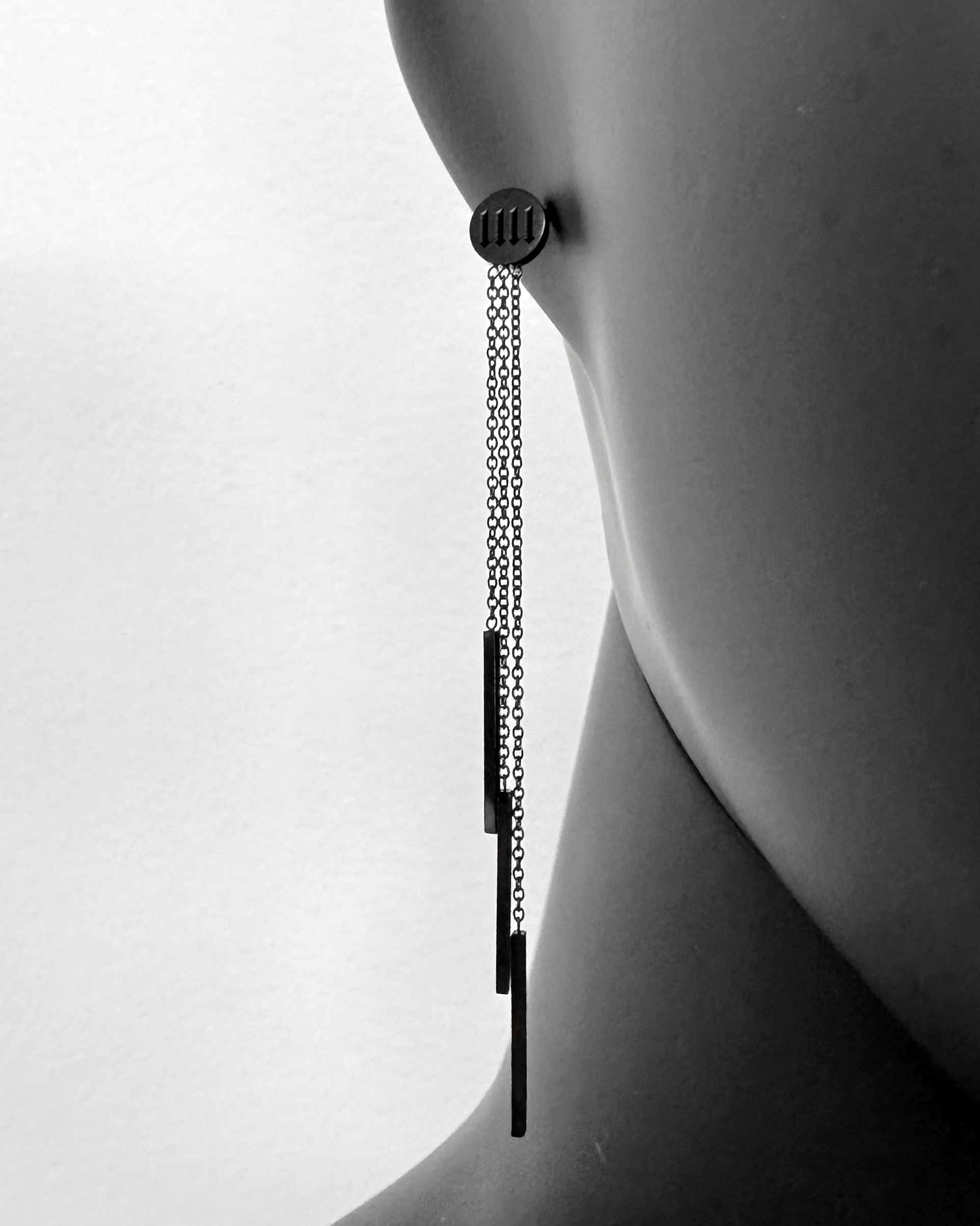Designed as drop earrings with an 8mm circular post, the lightweight chains and bars create movement without heaviness. A push-back closure ensures secure, all-day wear.